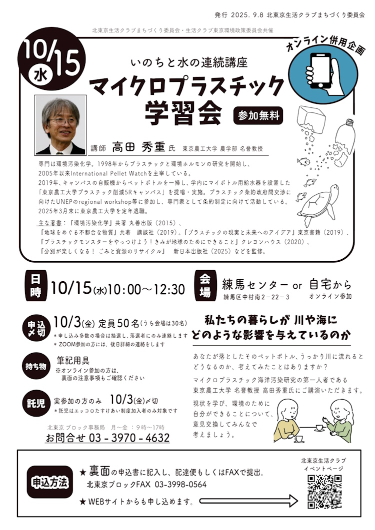 <環境政策委員会主催/参加費無料>いのちを育む「水」をテーマに、生活クラブの4ブロックがリレー形式で実施する「いのちと水の連続講座」を開催します。
