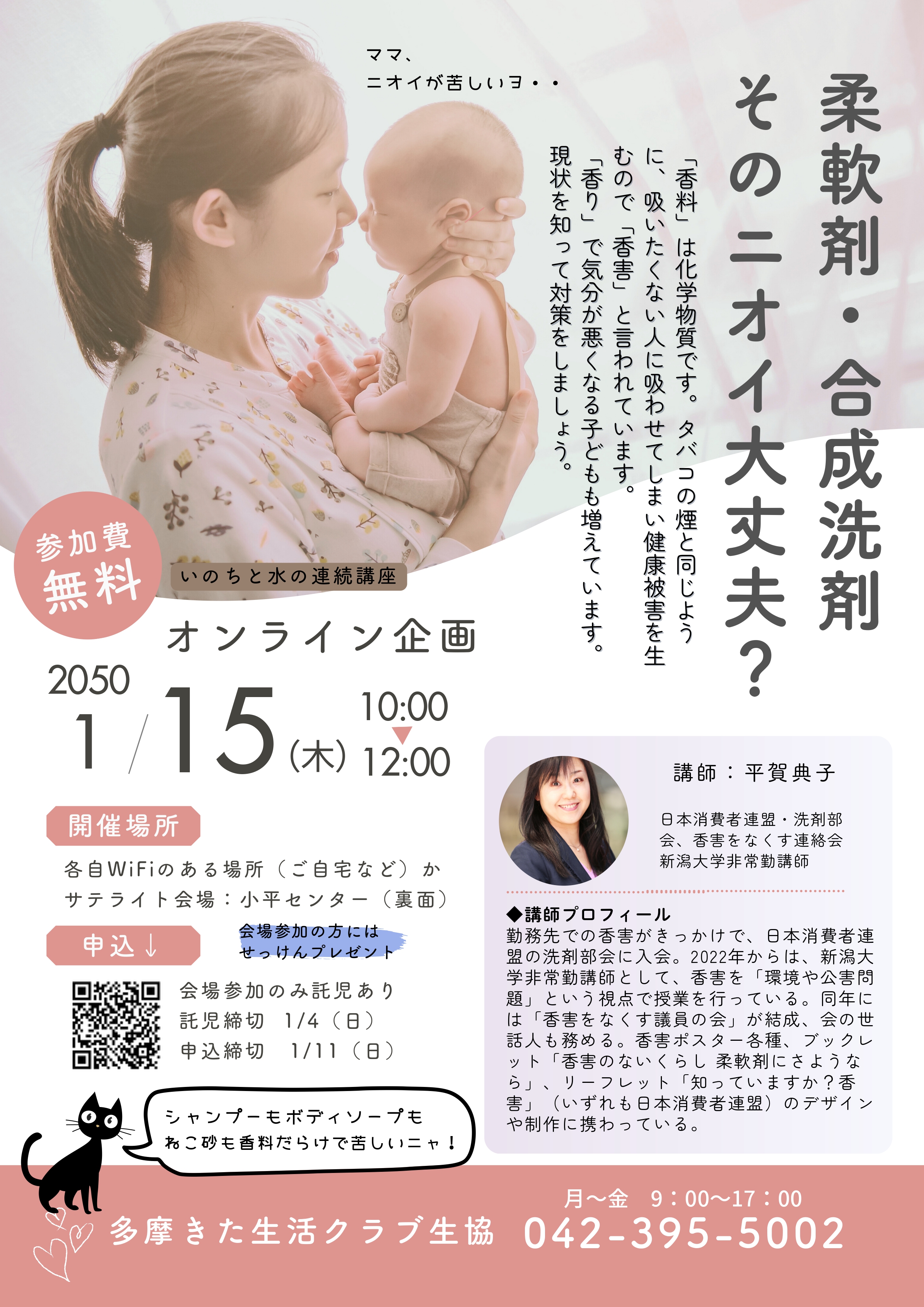 「香害」は化学物質が原因です。タバコの煙と同じように、吸いたくない人に吸わせてしまい健康被害を生むので「香害」と言われています。「香り」で気分が悪くなる子どもも増えています。現状を知って対策をしましょう。今回は、講師に平賀典子さんを迎え、どうして「香害」が起こるのか、私たちにどんな健康被害があるか、環境に及ぼす影響など、今知っておくべきことのお話を伺います。ニオイが苦手な方、周囲への配慮と思って使っている方も必聴!とてもわかりやすくおススメの企画です!!会場参加の方にはせっけんのプレゼントがあります♪