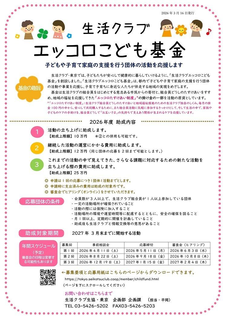 生活クラブ・東京では、子どもたちが安心して健康的に暮らしていけるように、「生活クラブエッコロこども基金」を創設しました。「生活クラブエッコロこども基金」は、都内で子どもや子育て家庭の支援を伴走型で行う団体の活動や事業を応援し 、子育て子育ちに身近な人たちが伴走する地域の実現をめざします。基金は生活クラブの組合員をはじめとする意志ある市民からの寄付と、組合員どうしのたすけあいをすすめ、地域の福祉を応援してきた「エッコロたすけあい制度」の掛け金の一部を原資としています 。