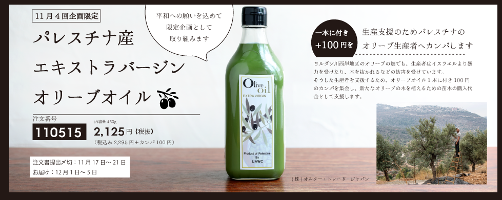 パレスチナの人々が、丹精を込めて育てたオリーブから作られたエキストラバージンオイルを、生活クラブ東京独自の限定企画として取り組みます。