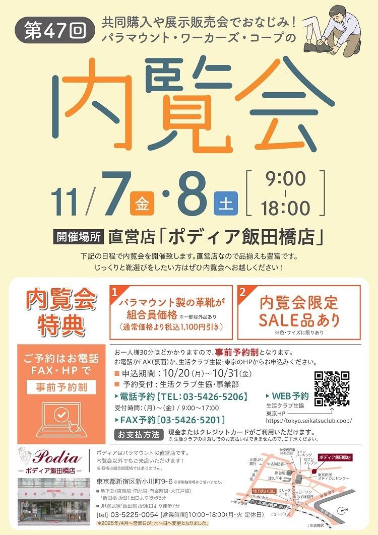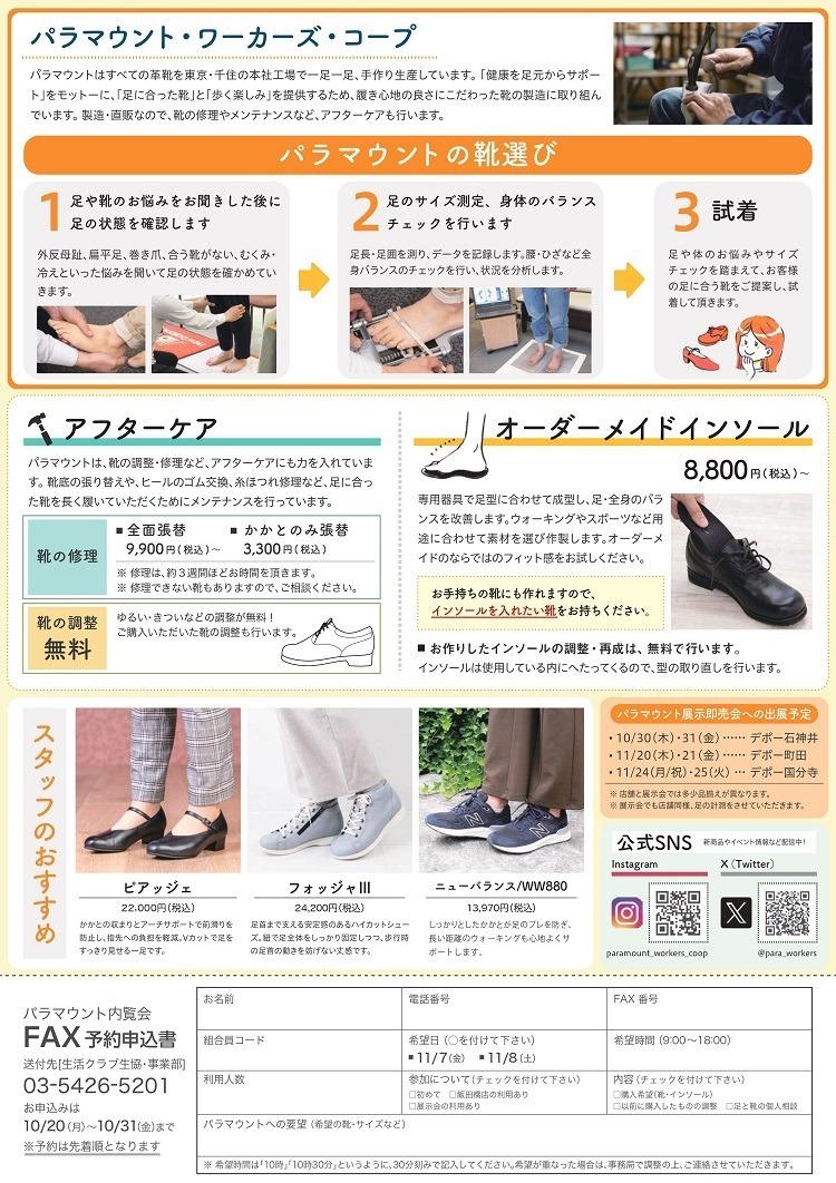 生活クラブ組合員向けに、直営店ポディアで内覧会を開催します。専門店内でお一人ずつ的確なアドバイスで靴をお選びいただけます。インソール調整、修理も承ります。