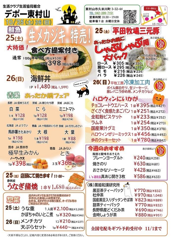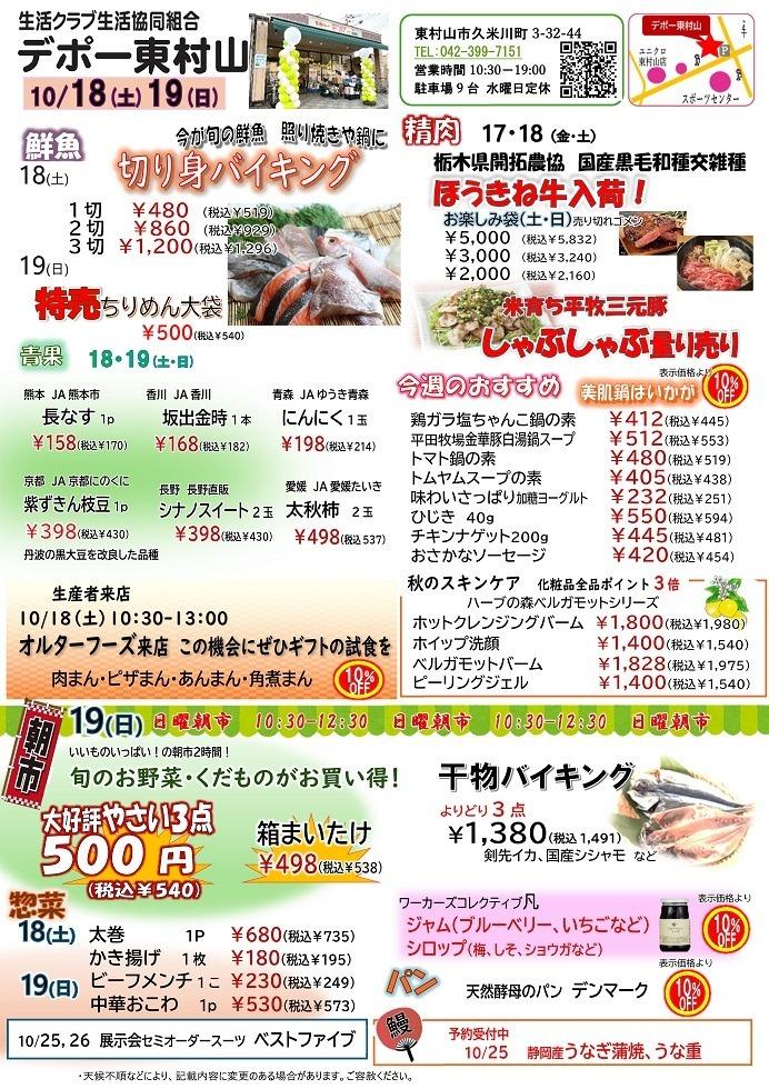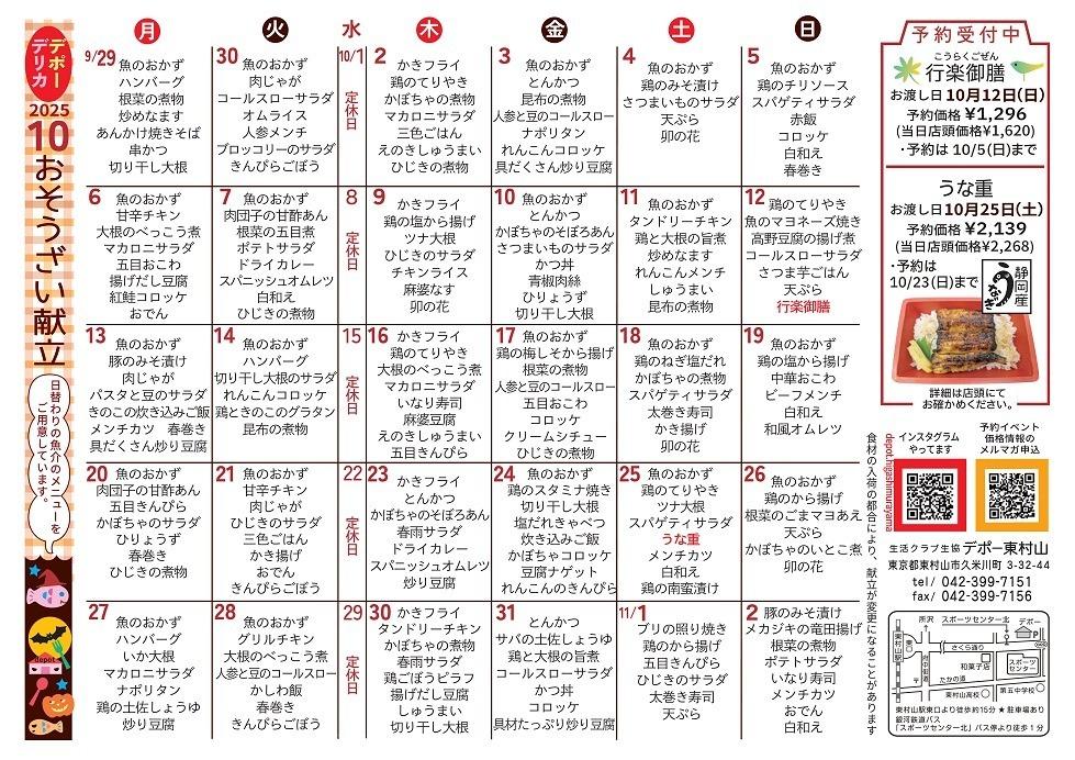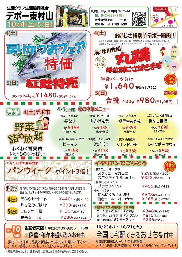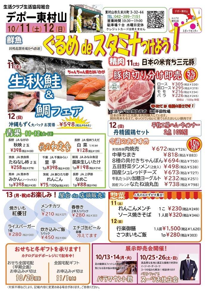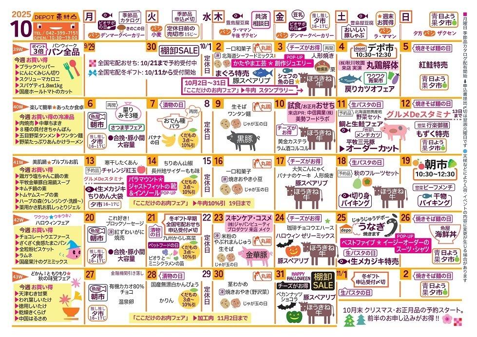 デポー東村山 10月カレンダー Tweet ▼10/25(土)~26(日) 生メカジキ特売ほか お買い得情報のご案内です ▼10/18(土)~19(日) 切り身バイキング他のご案内です ▼10/11(土)~12(日) ぐるめdeスタミナつけよう!生秋鮭&鯛フェアのご案内です。 ▼10/4(土)~5(日) 戻りかつおフェアのご案内です