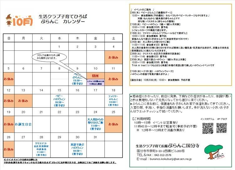 10月のぶらんこ国分寺は毎月恒例の『ベビーぶらんこ』、『ファミリーぶらんこ』に加え、ハロウィン等の季節のイベントが盛りだくさんです!