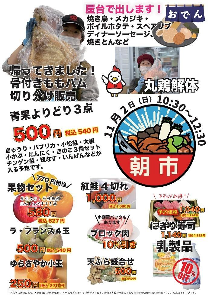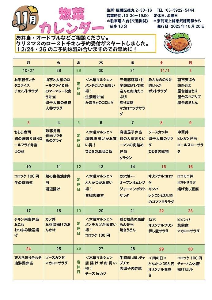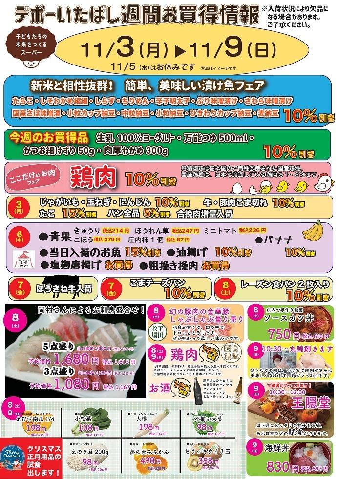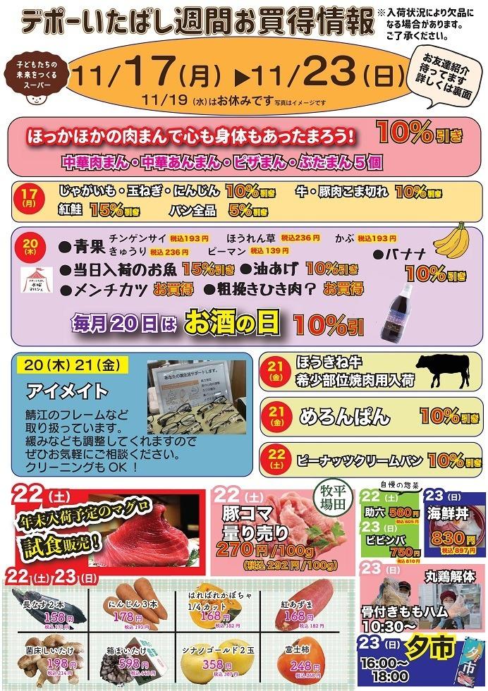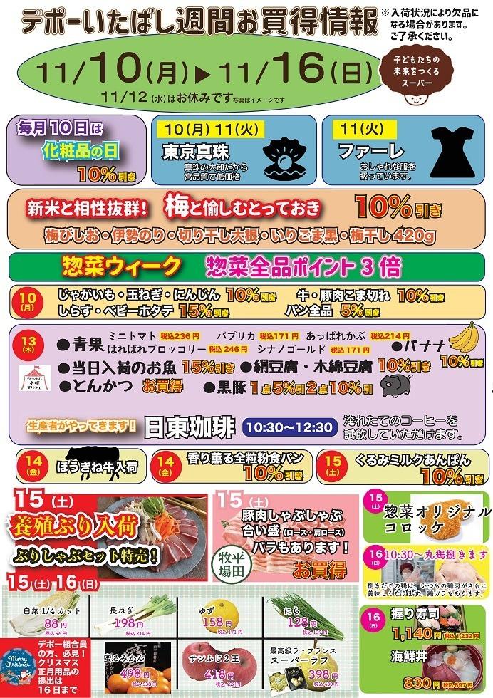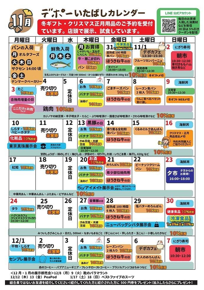 デポーいたばし 11月カレンダー Tweet ▼11/17(月)~23(日) 週間お買い得情報のご案内です ▼11/10(月)~16(日) 週間お買い得情報のご案内です ▼11/3(月)~9(日) 週間お買い得情報のご案内です ▼11/2(日) 朝市のご案内です