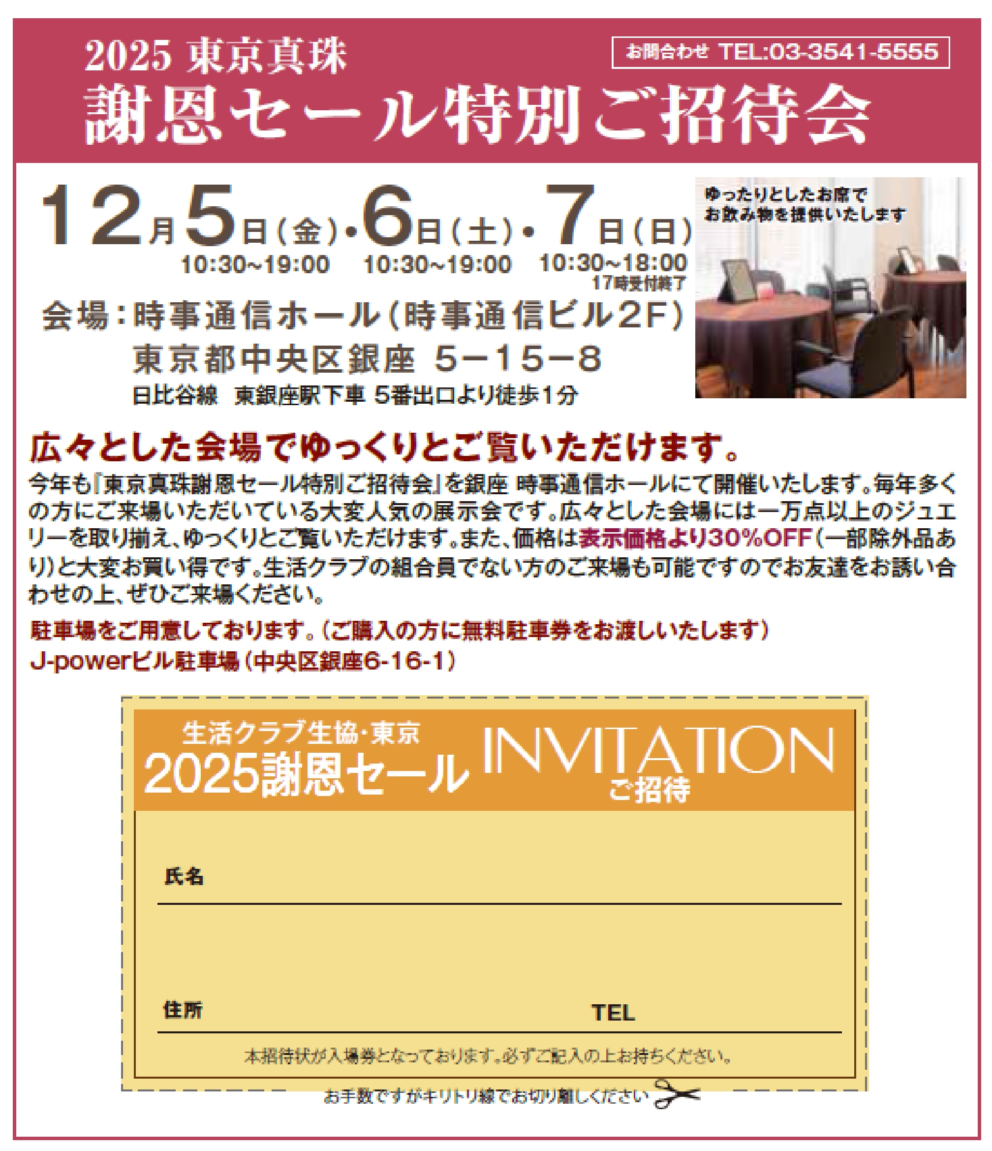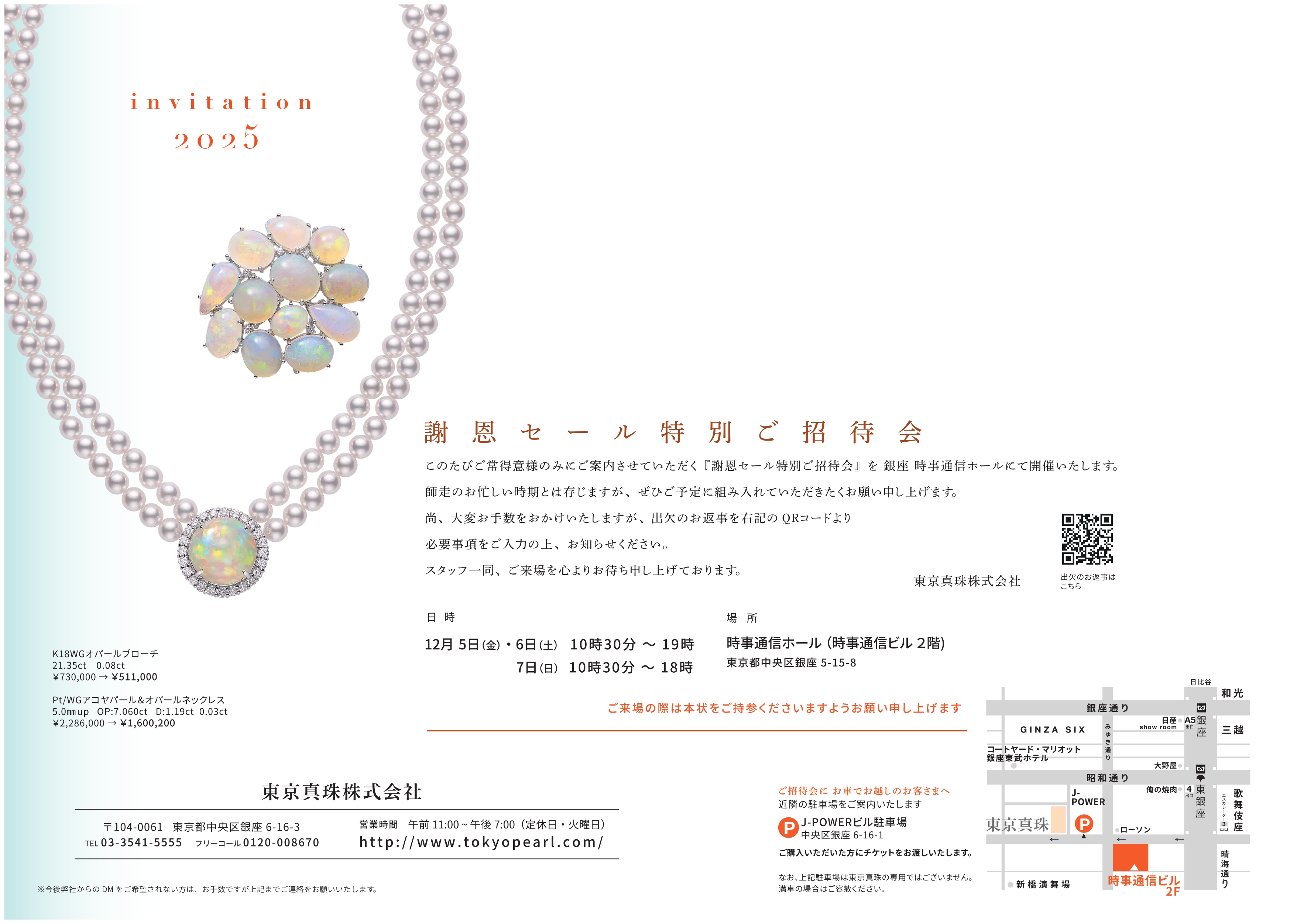 【12/5~7】東京真珠謝恩セール特別ご招待 開催日:2025年12月05日 Tweet 今年も『東京真珠謝恩セール特別ご招待会』を銀座 時事通信ホールにて開催いたします。毎年多くの方にご来場いただいている大変人気の展示会です。広々とした会場には一万点以上のジュエリーを取り揃え、ゆっくりとご覧いただけます。また、価格は表示価格より30%OFF(一部除外品あり)と大変お買い得です。 皆様のご来場を心よりお待ち申し上げております。 ■日時:12月5日(金)~7日(日)10:30~19:00 *7日は18:00まで ■場所:時事通信ホール(東京都中央区銀座5-15-8) ★内覧会についてのお問合せ 事業部 TEL.03-5426-5206 (9時~17時 月~金) 【2025年10月21日掲載】