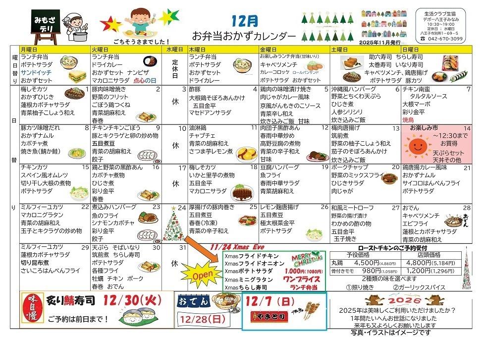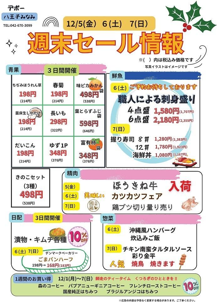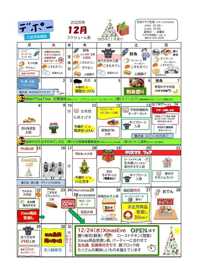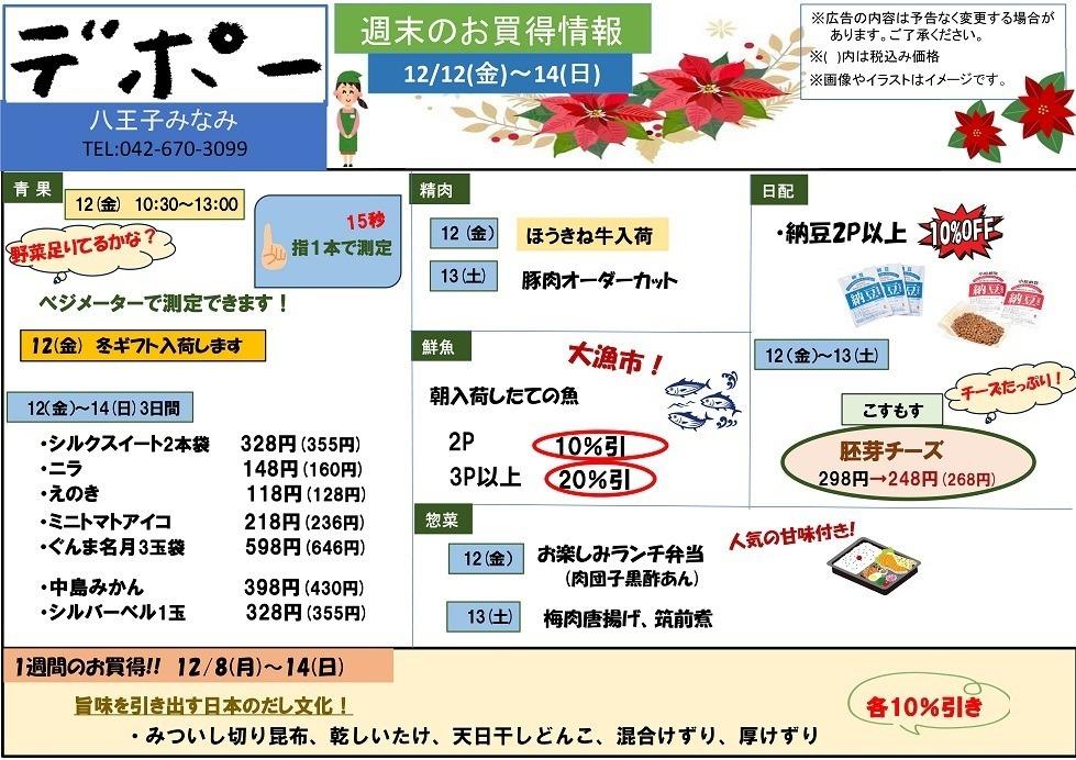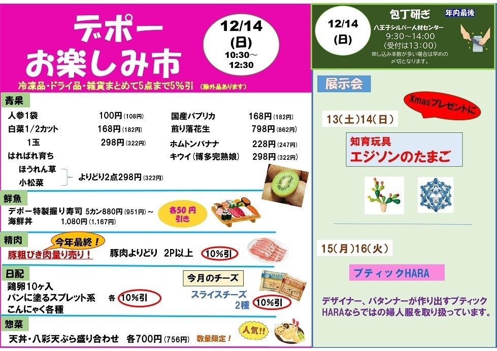 デポー八王子みなみ 12月カレンダー Tweet ▼12/14(日) デポーお楽しみ市のご案内です ▼12/12(金)~14(日) 週末のお買い得情報のご案内です ▼12/5(金)~7(日) 週末セール情報のご案内です