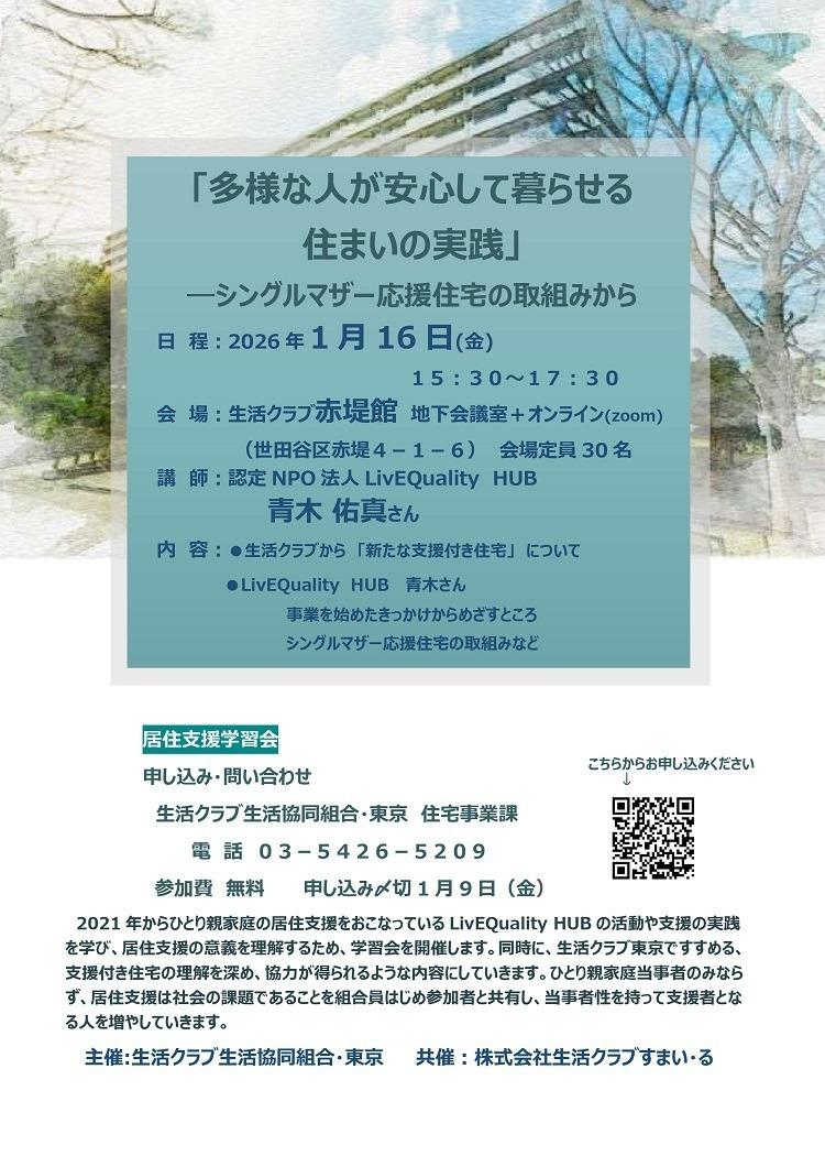 | 内容 | 【LivEQuality HUB 青木佑真さん】 ・事業を始めたきっかけからめざすところ ・シングルマザー応援住宅の取組みなど 【生活クラブ東京】 新たな支援付き住宅について |