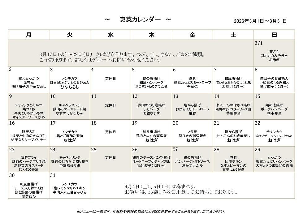 デポー石神井 3月カレンダー