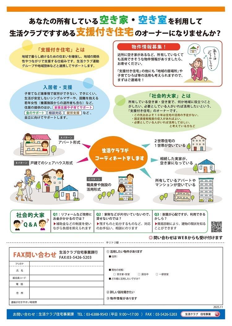 あなたの所有している 空き家・空き室 を利用して、生活クラブですすめる 支援付き住宅 のオーナーになりませんか?