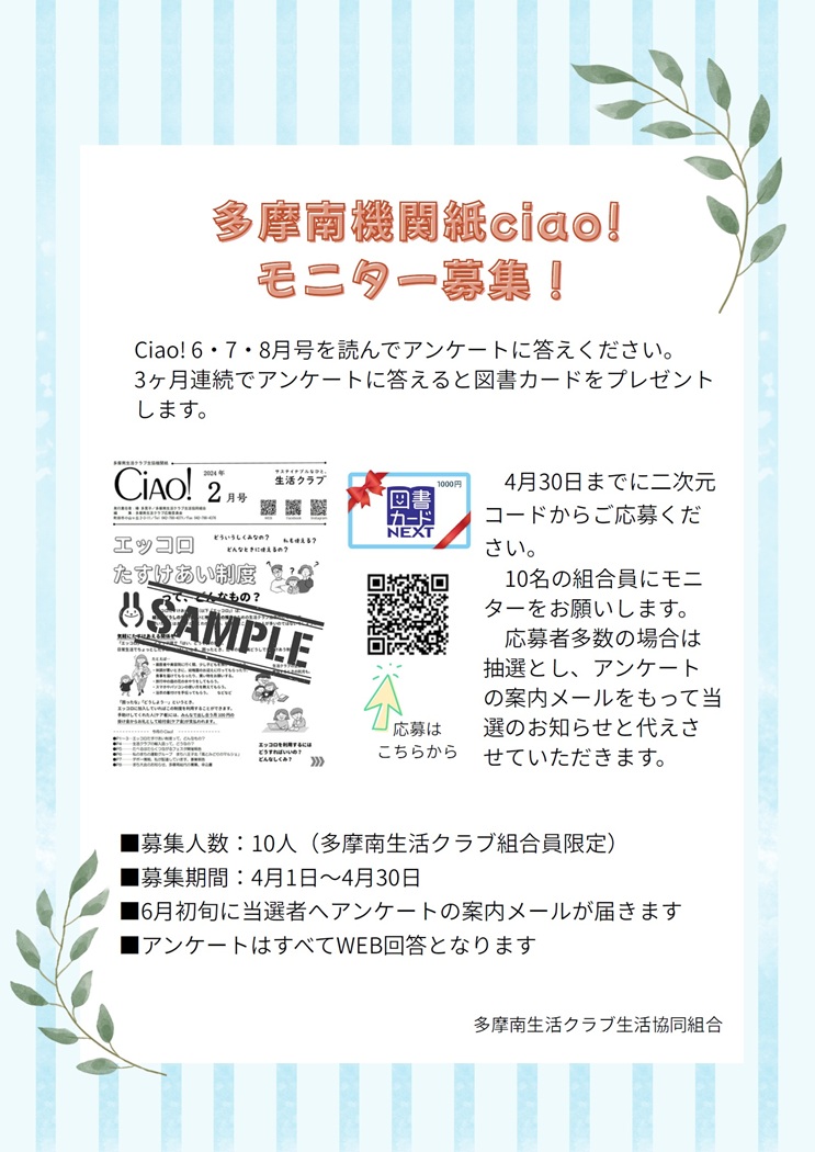 さらに読みやすく、暮らしに役立つ機関紙『Ciao!』をつくるため、2026年度Ciao! 6月号~8月号(3号分)のモニターを募集します!